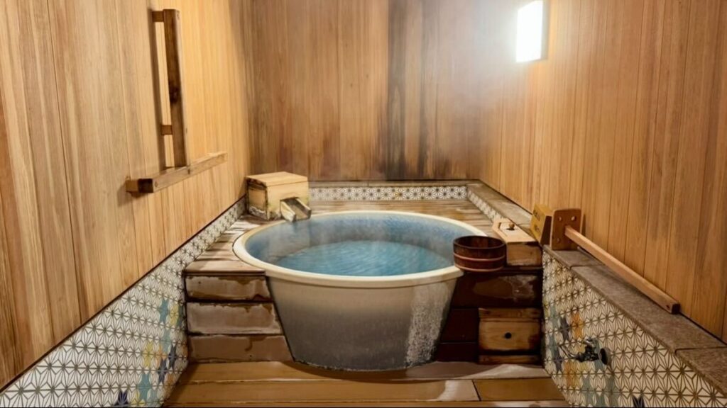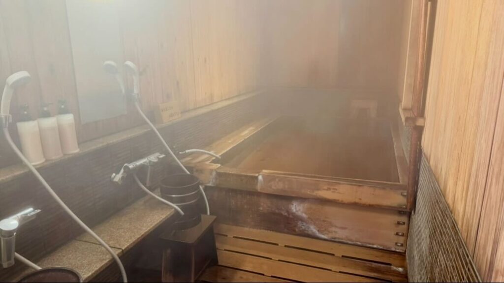 お部屋に荷物を置いたら、まずは1回目の温泉へ向かいます。長く浸かれるタイプの温泉ではないので、1回あたり5〜10分、1日2〜3回入ろうと決めてきました。